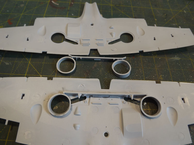 I was going to fit the front lower cowling next but the wings need to go on first. They start with the wheel tubs and front spar, though I managed to snip the front one for the second wing!