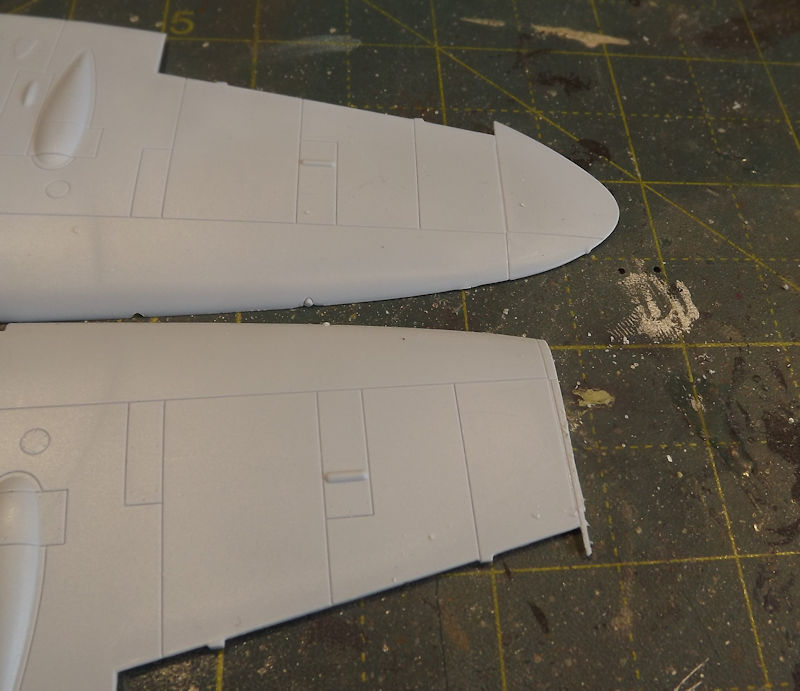 Time for a decision, or 'how to convert a double build into a single one'. I decided to clip the wings of one aircraft. I marked the cut point with dymo tape and cut of the tip. I left it long so it could be sanded flush later.