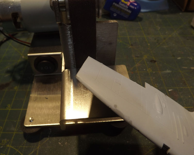 With the glue dry, the wing tip can be sanded flush using my new toy, a mini belt sander.