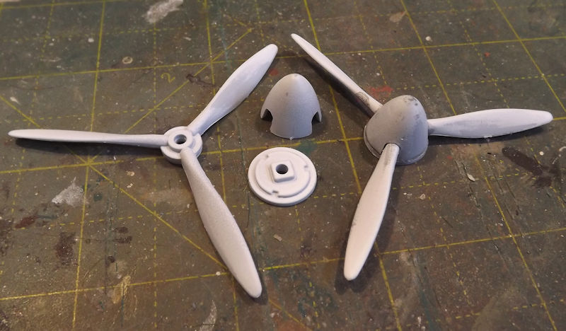 The propellers are formed from a two part hub and single peice three bladed propeller. It goes together well, with just a little sanding needed around the base of the hub,