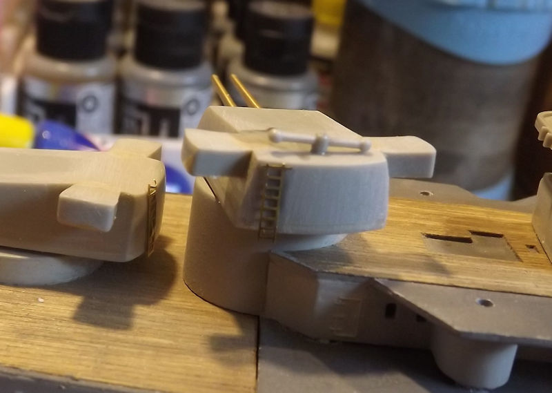 There is a ladder on the rear of each main turret. More White Ensign ladder, this time trimmed to length. Turret 2 and 3 also have a range finder on the roof. The kit has them too high so I lowered them when fitting.