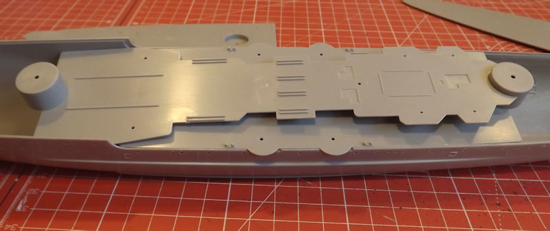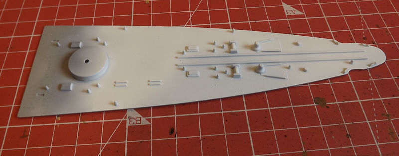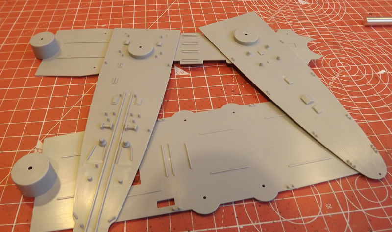 The main decks come in four parts. Two lower parts forming the center and rear deck. And another two forming the higher fore and mid deck. They come off the sprue and clean up quite easily.