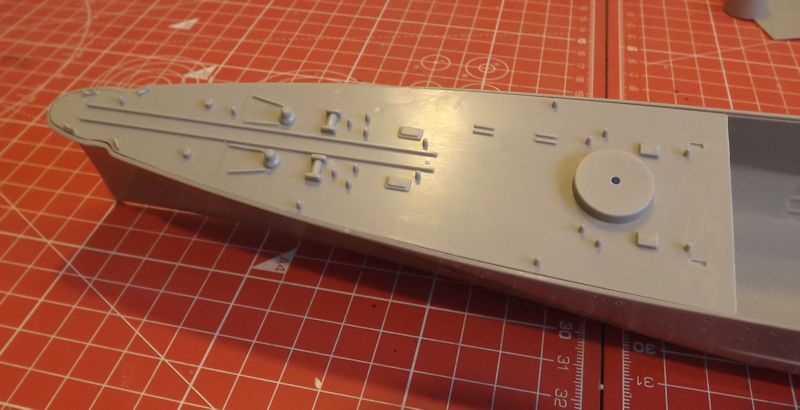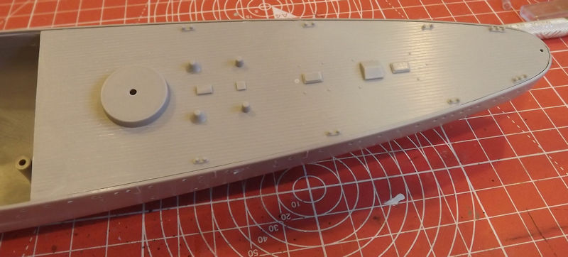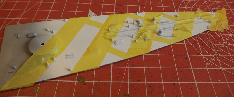 When it's time to paint the decks, the stripes will be masked. Next thing is to assemble the superstructure parts ready to paint them.