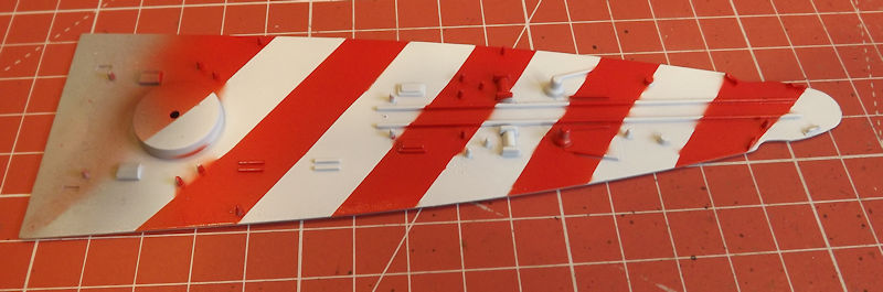 The fore deck has red and white stripes, which should be interesting to do. The deck was primed with grey Badger Stynylrez, then sprayed with Basic White from Mr Paint.