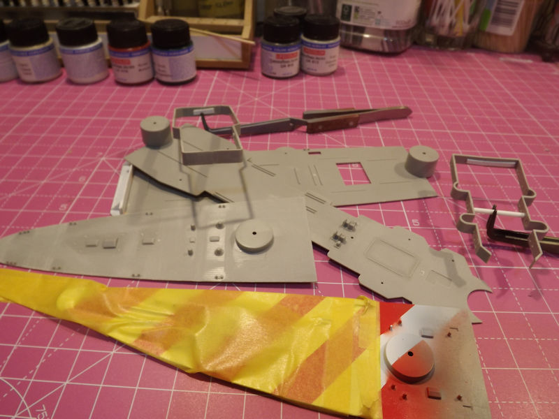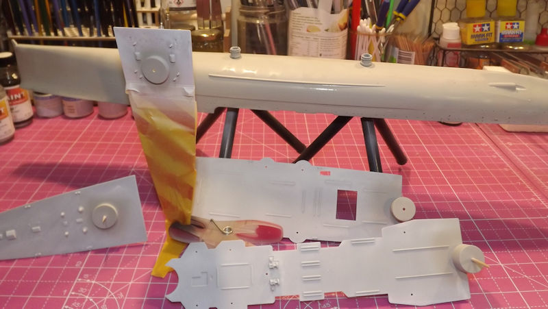 The horixontal surfaces werre sprayed darker grey and the decks test fitted.