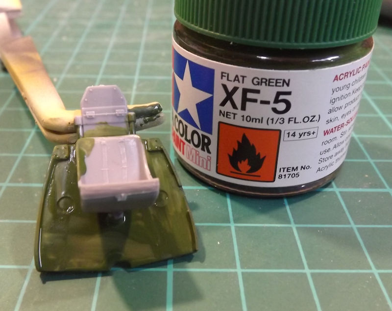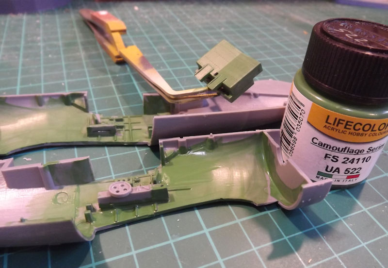 The instructions call for a colour mix of 2 parts Tamiya XF-5 green and 1 part XF-3 yellow. But I have a Lifecolor equivalent so will use that instead. This goes onto the sides and floor.