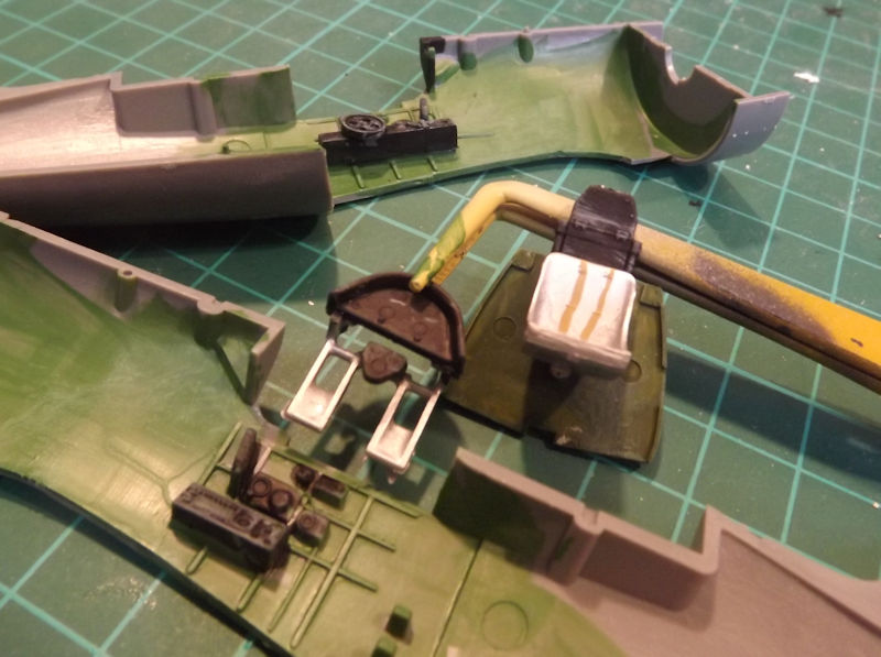When the greens were dry, the control boxes were painted black and dry brushed. Then the seat and pedals were painted aluminium. Khaki was used for the seat belts.