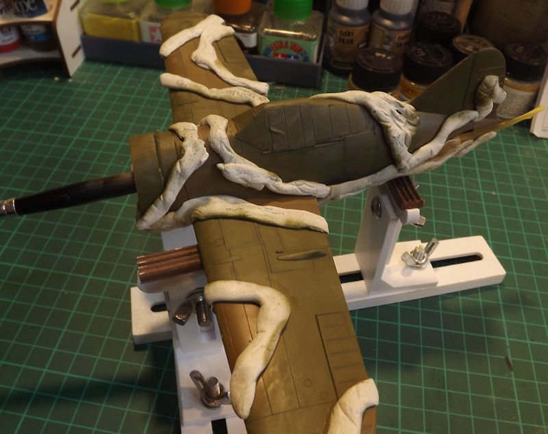 While preparing to spray, I realised that the primer had got into the mechamism and gummed up the needle, so I switched to another airbrush to use. Lifecolor RAF Sky was sprayed onto half of the underside.