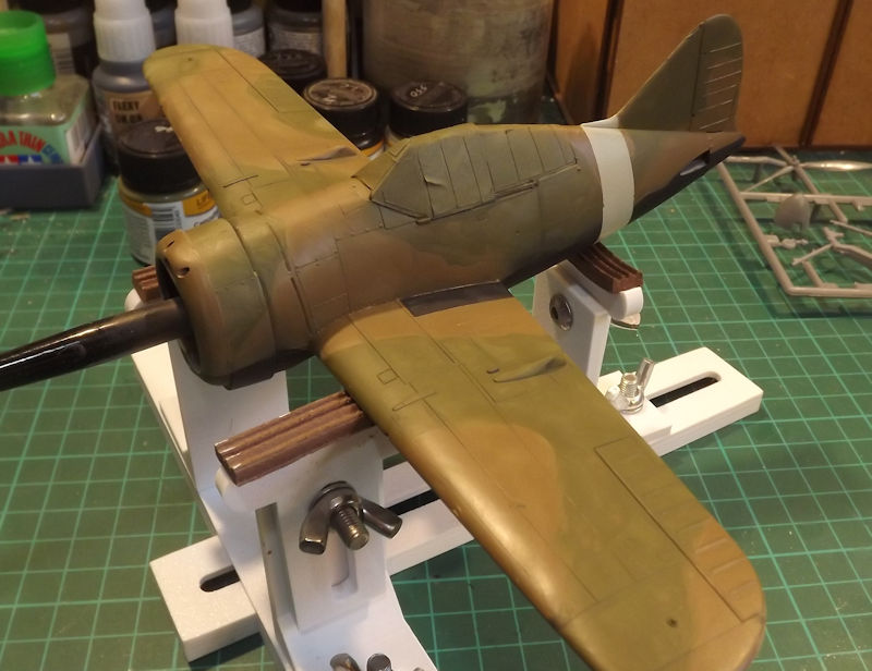 After taking apart my main airbruch for cleaning, the sky was masked and the other half sprayed black. I alsi sprayed the waslkways on the top of the wing. It was about now that I remembered the sky band rouind the rear fuselage. This was sprayed, masked and the black touched up.